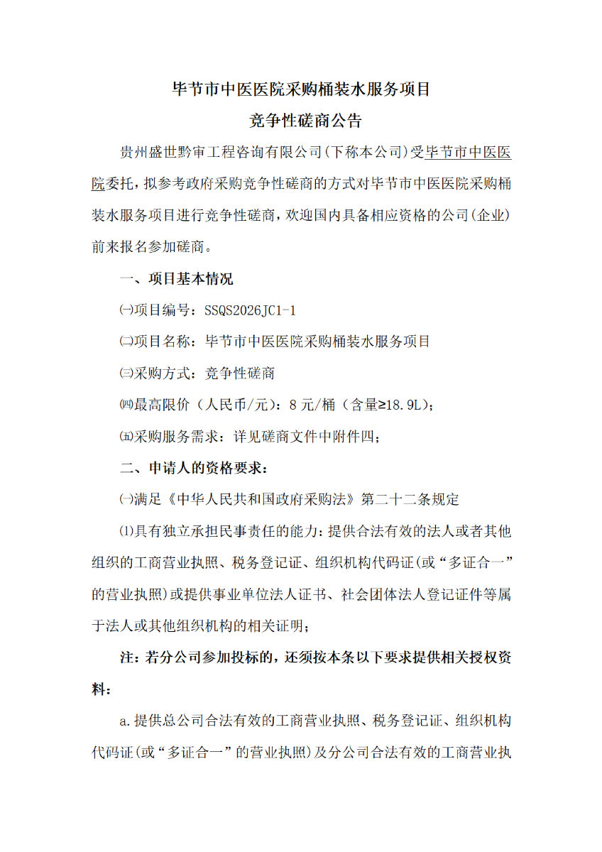 毕节市中医医院采购桶装水服务项目竞争性磋商公告